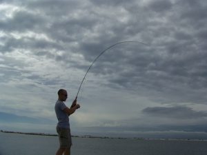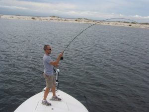 We started our morning at 4:00 a.m. watching the rain fall on the street wondering if today’s trip was going to be over before it even had a chance to start. Today was scheduled to be 2nd Lt Josh Kerzie’s first attempt at saltwater fly fishing. When facing a tough day like this we both agreed the best thing to do was head to the Waffle House and watch the weather for a little while. After a short breakfast, the rain had stopped and we were on our way to the water. We started the morning off with artificial baits on spinning tackle. The pre-dawn bite was slow and as the sun began to rise i decided to move to our next spot. Upon arriving, Lt. Kerzie and i both caught some Spanish Mackerel and a few Bluefish. It was time, we decided to break out the Fly rod and see if any of these fish would like the fly’s Lt. Kerzie had tied for just such an occasion. I climbed on the platform and began to pole us towards the schools of bait that were being tossed around by the feeding Spanish and Bluefish. Within the first couple of cast Lt. Kerzie had proof that our fish appreciated his fly tieing skills. Moments after the first few fish were landed i realized that i was being treated to a fly fishing seminar compliments of the USMC.