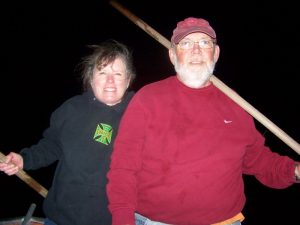 Tonight i was able to guide Mr. Herschel Johnson and his wife Brenda on a Flounder Gigging trip.This was Brenda’s first time floundering and boy did she catch on quick. With the wind blowing 10-15mph out of the East we were confined to a couple shorelines that were protected from the wind. Visibility being good on those few spots we started our mission of looking at all the critters that were stirring on the night before Thanksgiving. In just a few short minutes , we were able to harvest our first Flounder. With the first one on ice pretty quick, i felt good about the possibilities for the night’s adventure. Before to long Brenda was scooping up big Bluecrabs like eggs on a Easter egg hunt. Herschel was able to harvest some huge Mullet that fit nicely in the icebox with the eight Flounder and oodles of big Bluecrabs. I had a great time with these two and with a fishing trip scheduled for the next day i knew our adventures were only gonna get better. After spending our evening together sharing stories i can say that the Johnson’s love the outdoors and make the most of their vacations each year. With four deer already in the freezer this year to show for their efforts in the woods and fish from both fresh and saltwater vacations, they are going to eat very well this winter. I would like to thank the Johnson’s for bearing with the Captain as he started the trip by trying to figure out why the Q-beam was keeping the boat from making way. After ditching the Q-beam everything was fine!!