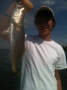 This mornings trip was with Clyde Parish and his son DJ from Brandon, Mississippi. We were on the water before daylight and at our spot throwing topwater baits as the sun began to rise over the bay. The topwater action has been really hot lately and today was no exception. Both father and son had no problem taking the Speckled Trout on the artificial baits being that they are experienced fresh water anglers. After a couple hours the bite slowed and we were off to another spot in search of the ol’ Redfish. We managed to locate a few more Trout at this spot with old faithful Gulp Shrimp and then we scooted around to the Redfish hideaway. Switching baits yet again resulted in 8-10 Redfish being caught on top of the 20-25 Trout that we had managed at the other locations. With a 250 Yamaha pushing the Tarpon Bay 21′ Lost Bay Guide Service is able to get clients to several spots in a trip increasing our odds for more fish without burning a bunch of valuable time. The Parish team had also booked a Flounder Gigging trip for the same night so after a pile of fish were caught we called it and headed for lunch.